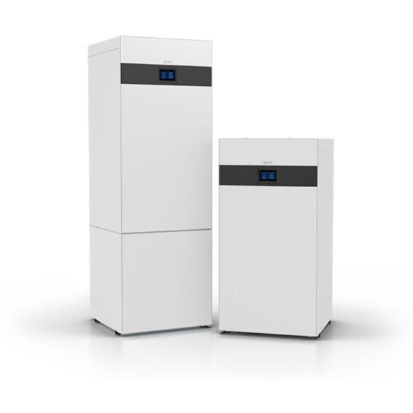 IVT Geo 700 finns som C-modell med inbyggd rostfri slingtank eller som E-modell med extern rostfri slingtank. Den inbyggda varmvattenberedaren ger upp till 300 liter 40°C tappvarmvatten, och för större behov finns extra varmvattenberedare i samma design som värmepumpen.